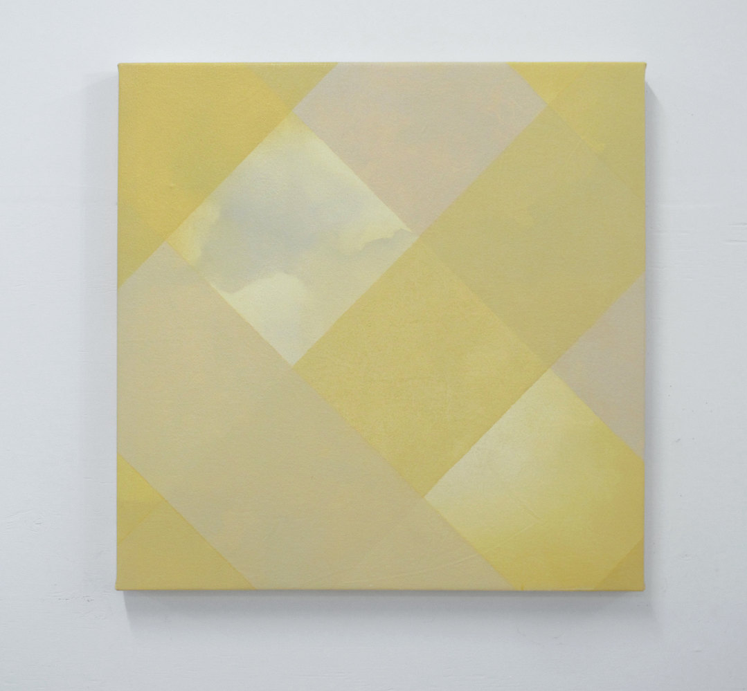 The atmospheric underpainting — that hazy, dreamlike ground that peeks through the geometry — came first, applied in loose, sweeping strokes that Landry describes as almost meditative. She let it dry slowly, returning to it over several sessions, watching it deepen and shift. When the grid was finally laid over the top, the contrast was immediate and electric. The structure seemed to both contain and liberate the softness beneath it.
