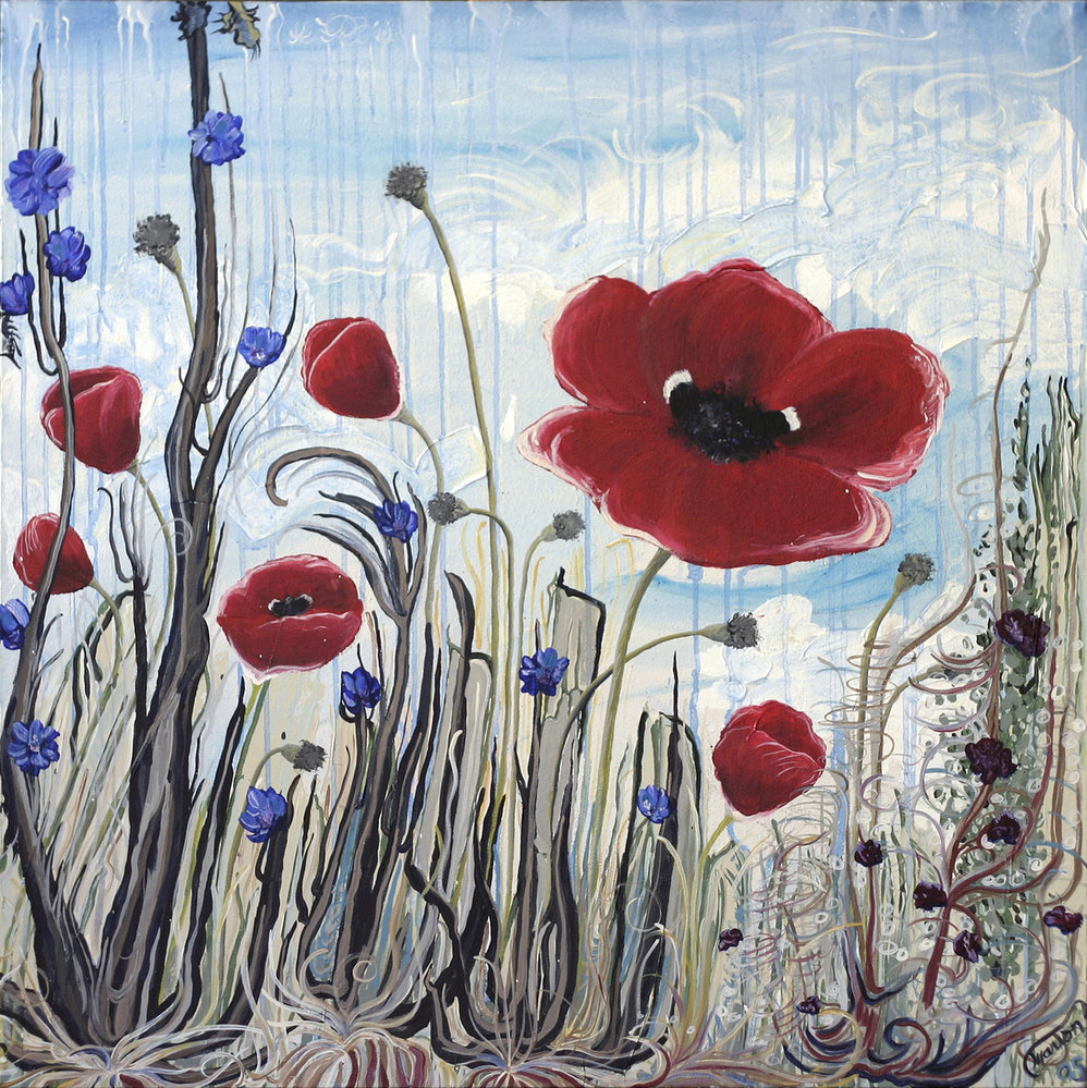 Artist Marion Landry first conceived of the piece years before a single stroke was applied to canvas. The image lived in her mind — those defiant poppies, blazing red against the cooling tones of late autumn — but every attempt to begin felt premature. The inspiration was there in concept, yet the execution remained elusive. "I knew what I wanted to say, but I hadn't yet found the language to say it," Landry reflected.
